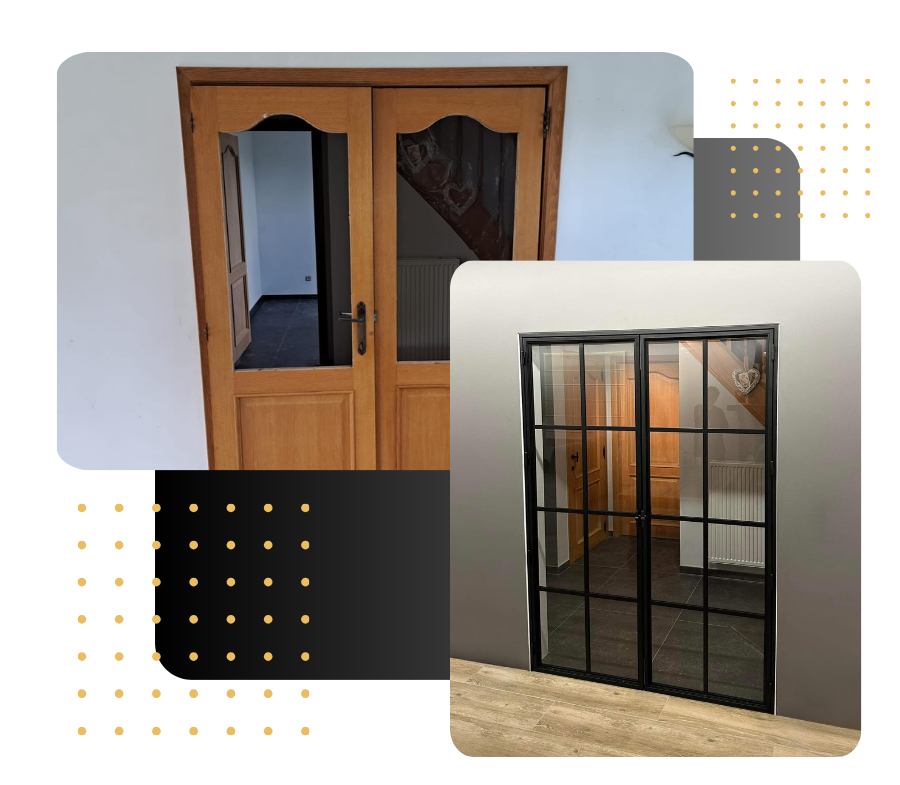 Grâce à un design moderne et raffiné, chaque porte est conçue sur mesure pour répondre parfaitement à vos besoins esthétiques et fonctionnels. Comme le montre cet exemple avant/après, nos créations allient beauté et praticité, offrant à la fois une séparation élégante et une luminosité naturelle.